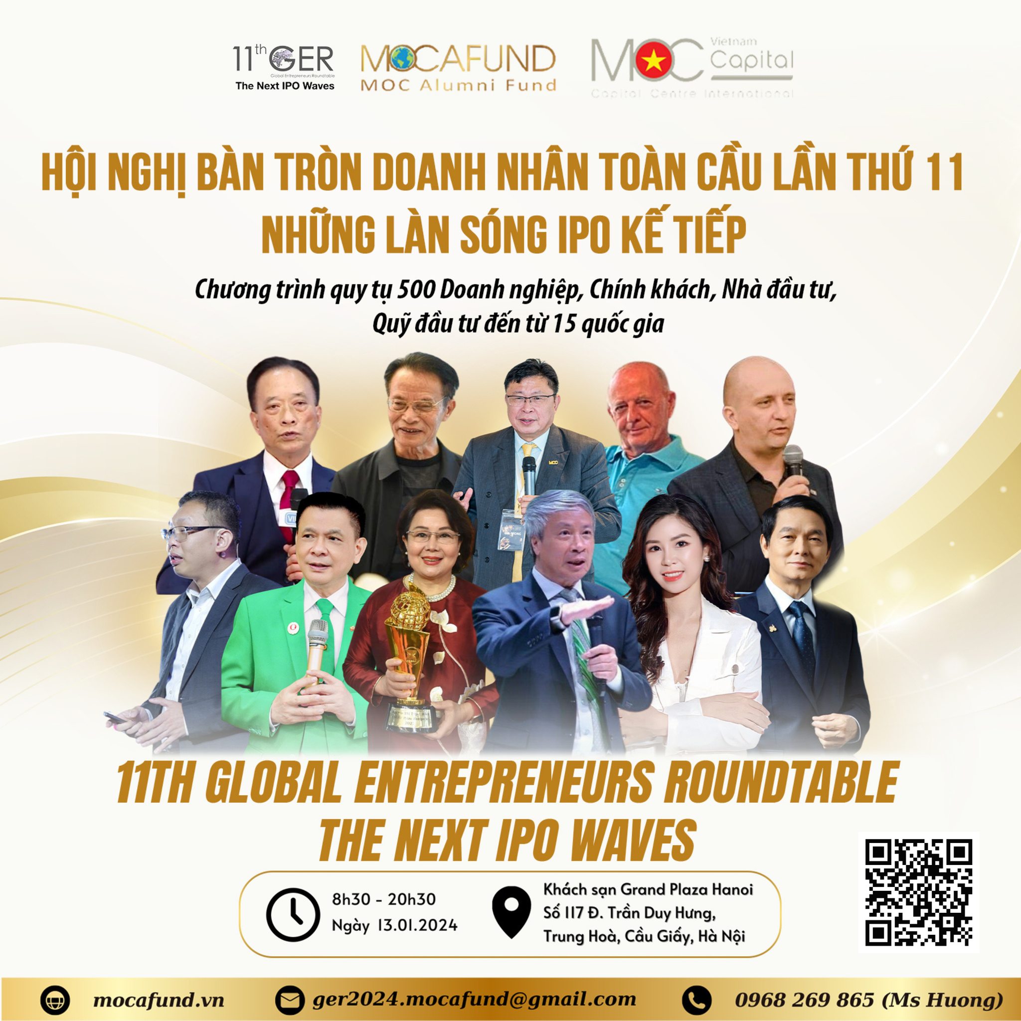“Hội nghị bàn tròn doanh nhân toàn cầu lần thứ 11 - Những làn sóng IPO kế tiếp - 11th Global Entrepreneurs Roundtable - The Next IPO Waves 2024” (Sau đây gọi tắt là “GER 2024”) là một chìa khóa dẫn đến kho báu "CƠ CHẾ VỐN" và “PHƯƠNG THỨC KHAI MỞ NGUỒN VỐN VÔ HẠN", đã được tổ chức nhiều lần tại nhiều quốc gia trên thế giới như: Đài Loan, Malaysia, Trung Quốc,… bởi cộng đồng IPO Quốc tế và để lại nhiều tiếng vang lớn. Năm nay, tại lần thứ 11 của Hội nghị, MOCAFUND nhận được vinh dự tổ chức sự kiện trên tại Việt Nam. Tại đây, mỗi doanh nghiệp, mỗi start-up đóng vai trò như những người đồng hành, cùng chia sẻ về tiềm năng doanh nghiệp cũng như tạo cơ hội để đầu tư, giải quyết bài toán vốn cho các dự án tiềm năng, kết nối sức mạnh cộng đồng doanh nghiệp cùng tầm nhìn và khát vọng.